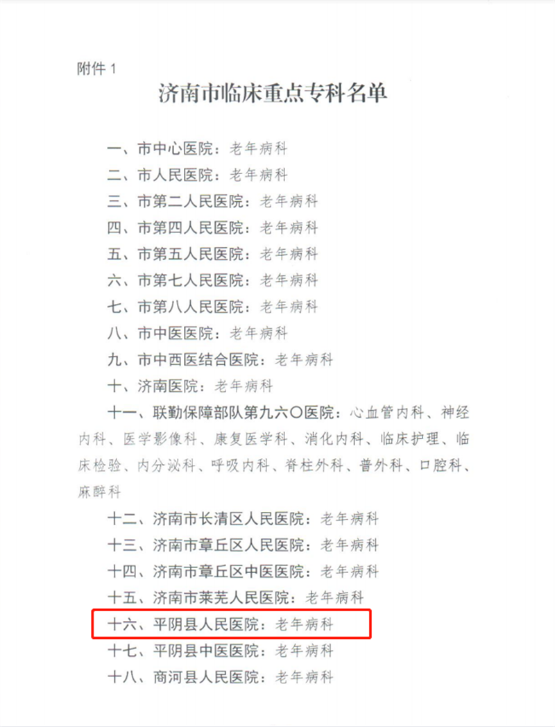 4月23日,济南市第二批临床重点专科名单公布,经济南市卫生健康委员会评审通过,平阴县人民医院老年病科被评为市级临床重点专科,这是医院重点专科建设的又一个里程碑。