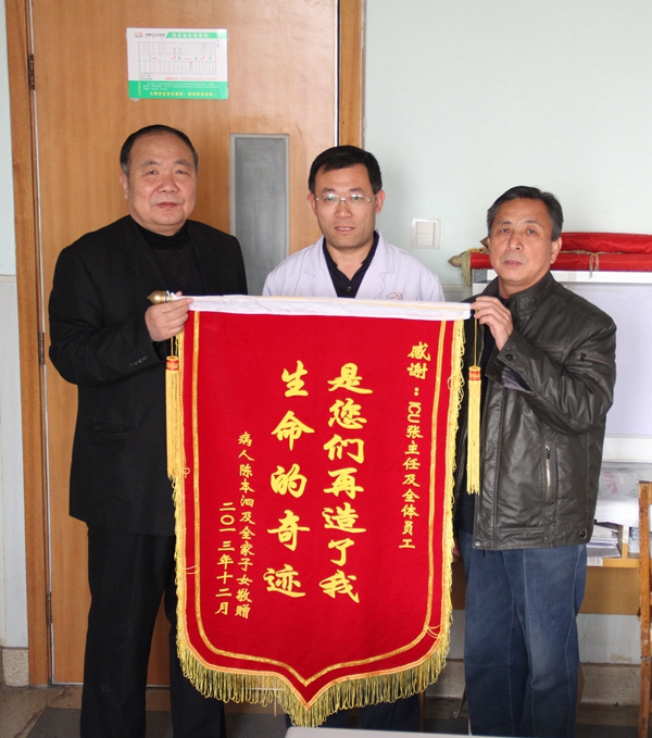 12月16日上午,陈大爷的子女举着一面锦旗走进了重症医学科办公室,将写有“是您们创造了我生命的奇迹”的锦旗当面送给了全科医生及护士,感谢他们对其父亲的用心诊治和无微不至的照顾。他的子女说:是咱们重症监护室,挽救了我父亲的生命。他马上要康复出院了,叮嘱我们好多次了,一定要让我们来代表全家衷心感谢张主任及重症监护室的全体医务人员,我们终身难忘你们高尚的医德和对我父亲精心的治疗,我们再一次感谢你们,也感谢医院培养了一群这么好的医护人员。