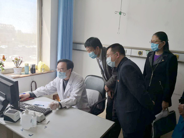陶庆福通过现场实地考察、查看登记资料、访问工作人员的方式,对预检分诊、内科诊区等重点区域进行了详细查看,对医院前期疫情防控工作给予充分肯定。