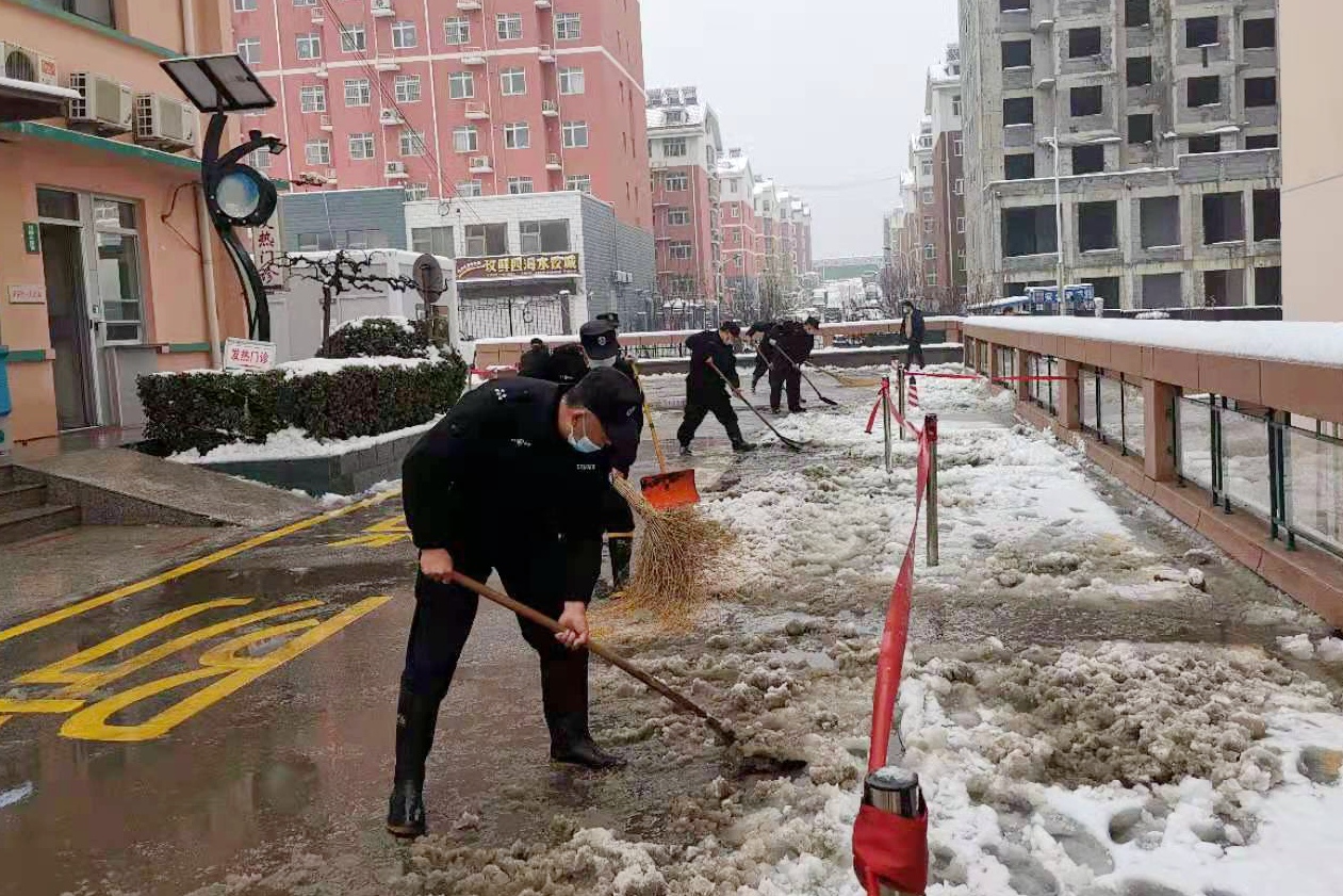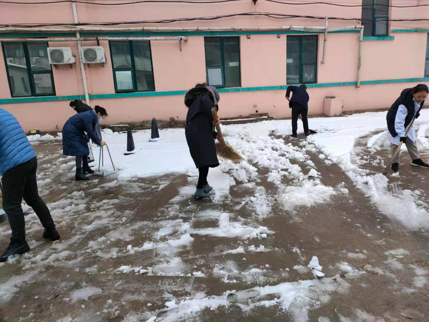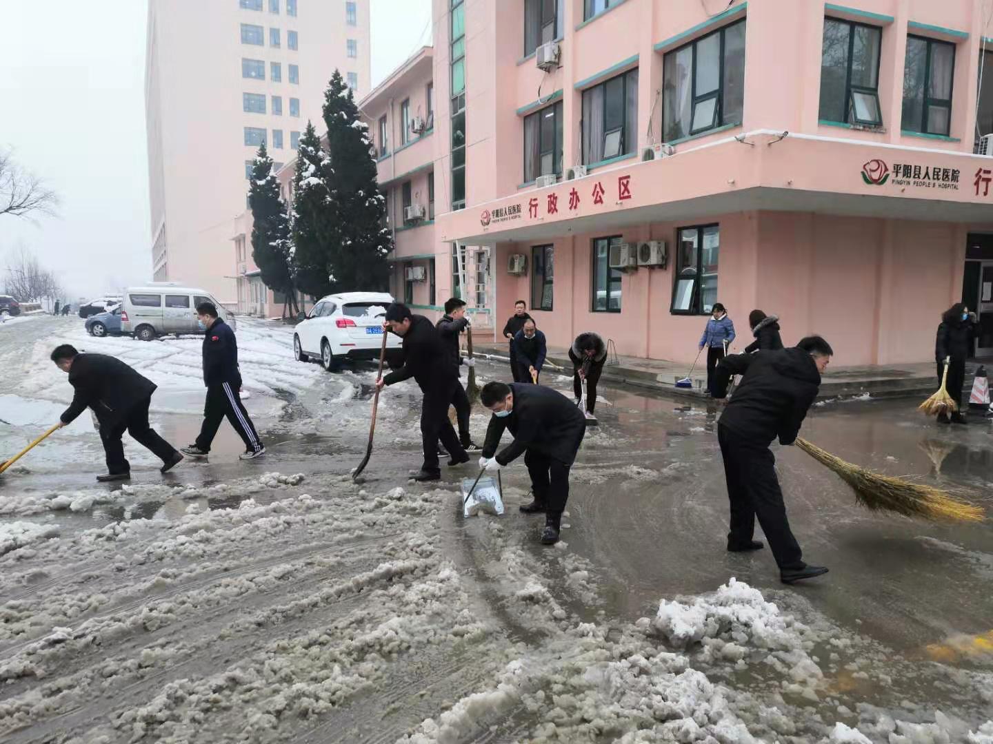 2月24日夜晚,我县迎来了2021年第一场雪。银装素裹的美景给大家带来欣喜的同时,厚厚的积雪也给出行安全带来诸多不便。为畅通交通,方便患者就医,25日清晨,平阴县人民医院领导班子带领保安、志愿者开展扫雪除冰行动。